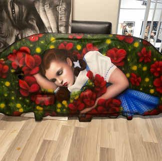 One of my favorite projects of this year was airbrushing a hood liner for a Dodge Durango show car. The theme for the car is Wizard of Oz so the owner requested the scene of Dorothy lying in the field of poppies. This project took about 8 weeks from prep to shipping. Done in Houston, Texas!